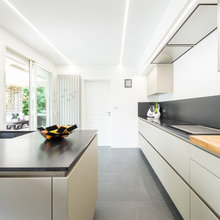 Top Cuisine Beige Pictures. Petite cuisine équipée, cuisine ouverte sur salon, parquet pvc en couleurs grisâtres, crédence en faïence beige et blanche, deux étagères massives en couleur beige crème, luminaire en métal. Cuisine beige / crème brillante avec plan de travail en silestone (cosentino).
