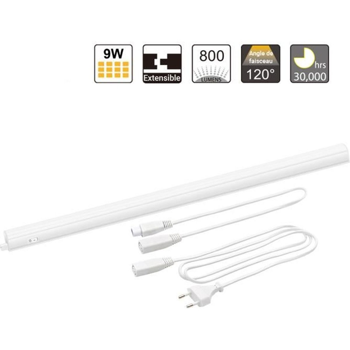 La lumière blanc chaud émise par comprend un interrupteur sur le boîtier, un câble d'alimentation avec une fiche ainsi qu'une fiche de raccordement pour aligner plusieurs réglettes du.