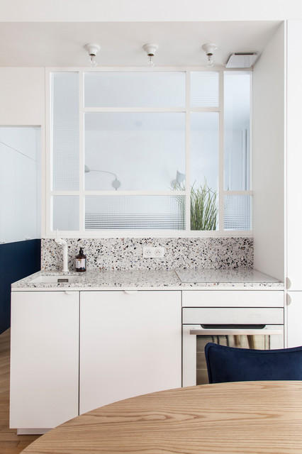 C'est une variante qui vous permet de délimiter les zones de l'intérieur et. Si la tendance est à la cuisine ouverte sur le salon, avant de se lancer, on cerne ses envies et ses besoins. Dans cet appartement, la volonté du client (qui est aussi architecte) était d'isoler la cuisine semi professionnelle de la salle à manger, où il organise.